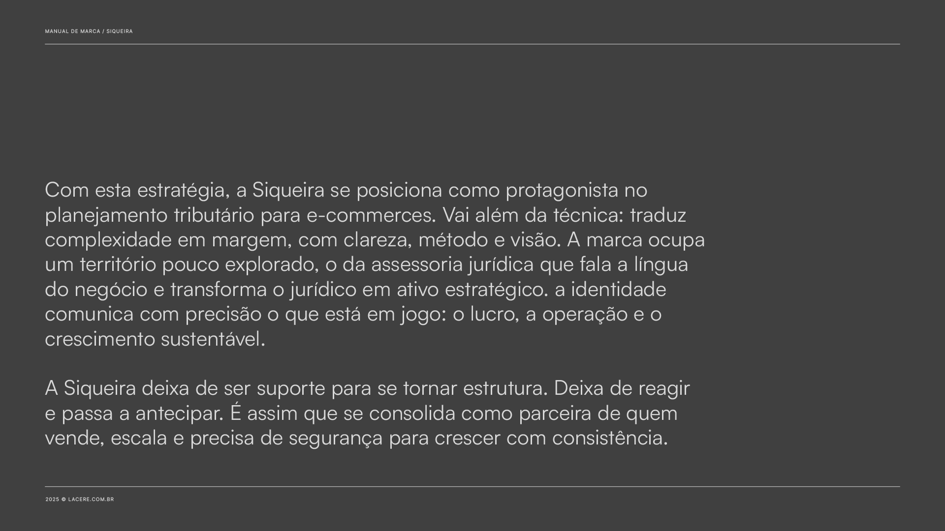 Com esta estratégia de marca e visual, a Siqueira se posiciona como protagonista no planejamento tributário para e-commerces. Vai além da técnica: traduz complexidade em margem, com clareza, método e visão.
